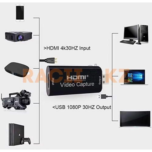 Адаптер видеозахвата HDMI - USB 2.0 предназначен для подключения источника HDMI-сигнала к компьютеру через USB. Он конвертирует аудио- и видеосигнал в формат, совместимый с большинством компьютеров и ноутбуков. Устройство удобно для записи видео, прямых трансляций, захвата игрового процесса или контента с внешних источников. Не требует сложной установки — достаточно подключить HDMI-устройство и USB-кабель к компьютеру, после чего устройство определится как видеовход.