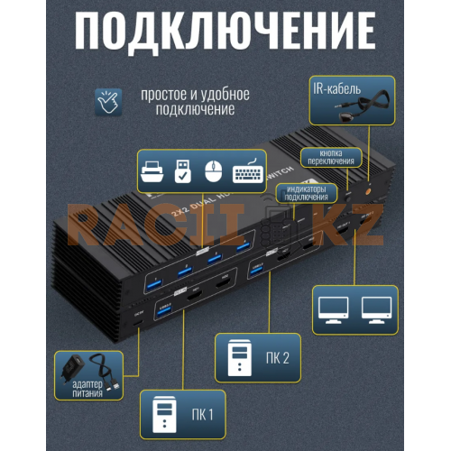 Двухканальный KVM переключатель 2x2 HDMI 8K 60Hz — устройство для управления двумя компьютерами с одного комплекта клавиатуры, мыши и монитора с поддержкой высококачественного видео.