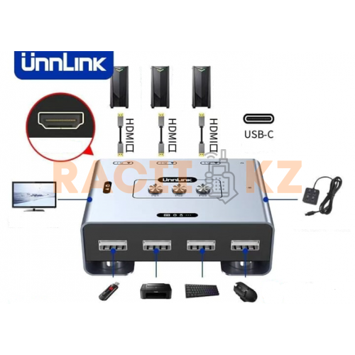 KVM-переключатель HDMI UnnLink 3x1 — функциональное решение для организации одного рабочего места с управлением тремя компьютерами. Устройство позволяет использовать один монитор, одну клавиатуру и одну мышь для нескольких ПК, обеспечивая порядок на рабочем столе и удобство переключения.