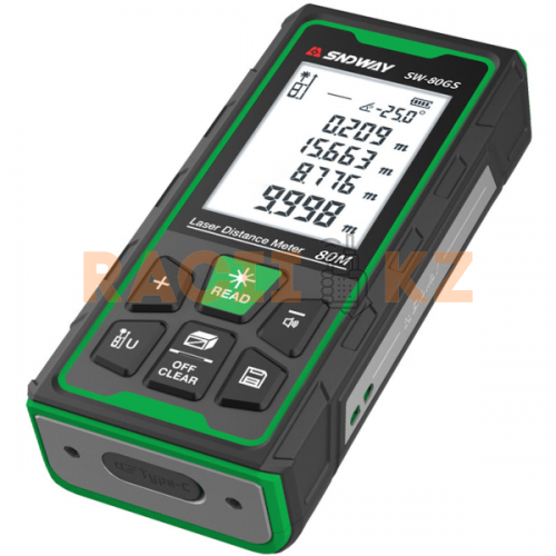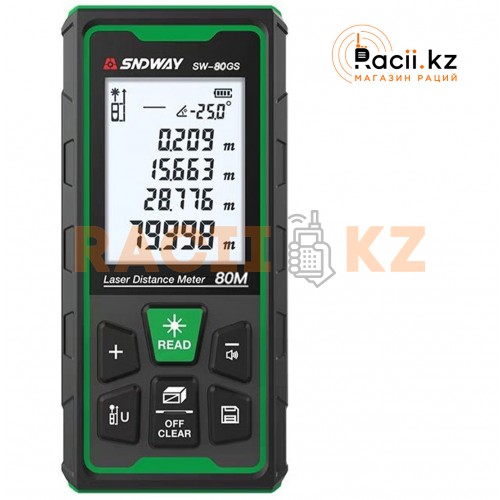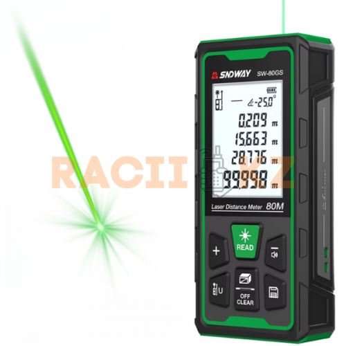 SNDWAY SW80GS — профессиональная зелёная лазерная рулетка для точных измерений на улице и в помещении. Зелёный лазер обеспечивает отличную видимость точки даже при ярком солнечном свете. Высокая точность ±2 мм позволяет уверенно работать в строительстве, ремонте и инженерных измерениях. Защита корпуса по стандарту IP68 делает прибор устойчивым к пыли, влаге и падениям. Компактные размеры и широкий набор функций превращают SW80GS в универсальный измерительный инструмент.
