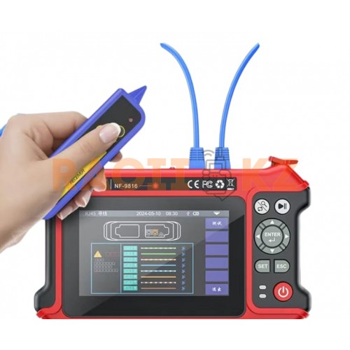 Инструмент OPM поддерживает измерения на восьми длинах волн, включая 10G, что делает устройство пригодным для современных высокоскоростных сетей. Визуальный локатор неисправностей и стабильный источник света позволяют оперативно обнаруживать повреждения и проводить контроль оптических потерь. Дополнительно NF-9816 оснащен расширенным функционалом тестирования кабелей RJ45: трассировка, проверка последовательности, измерение длины и поиск повреждений даже в условиях помех.