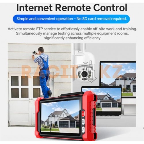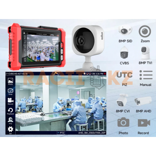 Прибор поддерживает тестирование IP-камер до 8K с кодеком H.265, отображая видеопоток без задержек, с возможностью создания снимков, записи и воспроизведения видео. Реализована поддержка более 30 частных протоколов производителей, включая DAHUA, HIKVISION, ACTI, Samsung и другие, а также полноценное управление PTZ-камерами по протоколам Pelco-D/P и аналогичным.