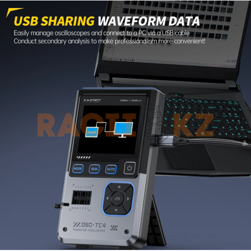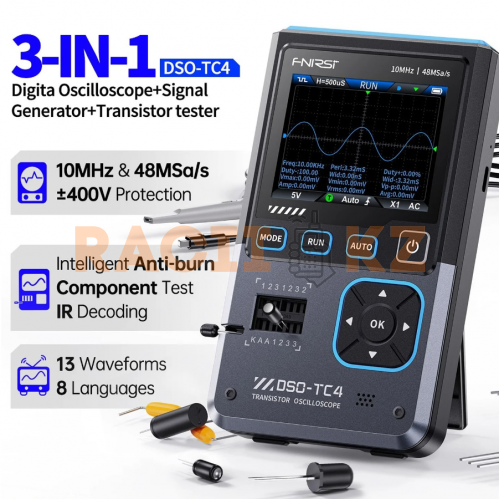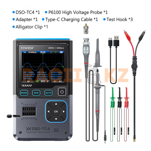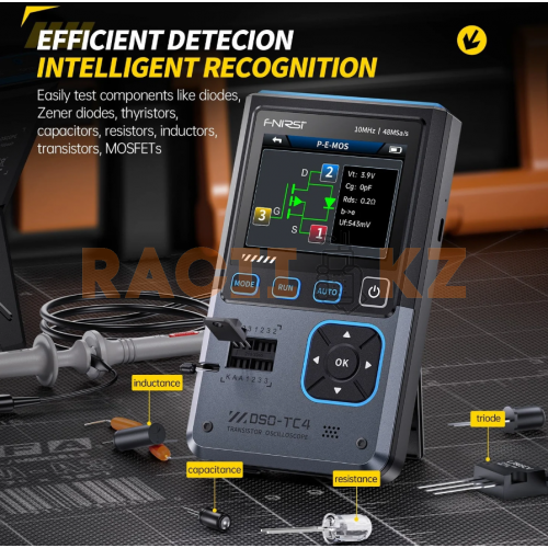FNIRSI DSO-TC4 позволяет автоматически определять тип подключённого компонента, распиновку и основные параметры. Тестер поддерживает транзисторы, диоды, тиристоры, MOSFET, резисторы, конденсаторы и катушки индуктивности. Встроенный осциллограф обеспечивает визуализацию сигналов с полосой до 10 МГц, а генератор сигналов позволяет формировать различные формы волн для проверки схем. Устройство оснащено цветным дисплеем и работает от встроенного аккумулятора с зарядкой через USB Type-C.