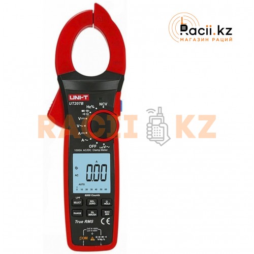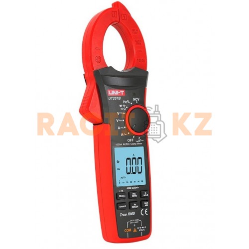 UT207B — это цифровой мультиметр с токоизмерительными клещами, предназначенный для измерений переменного и постоянного тока и напряжения, сопротивления, частоты, ёмкости и температуры. Он оснащён большим дисплеем с разрядностью до 6000, аналоговой шкалой и подсветкой, что удобно для работы в тёмных условиях. Устройство позволяет проводить прозвонку цепей, проверку диодов, удержание данных и отображает перегрузку и разряд батареи. Реализована функция True RMS для точного измерения и автоматическое переключение диапазонов. Работает от трёх батареек 1.5 В (ААА) и весит всего 950 г.